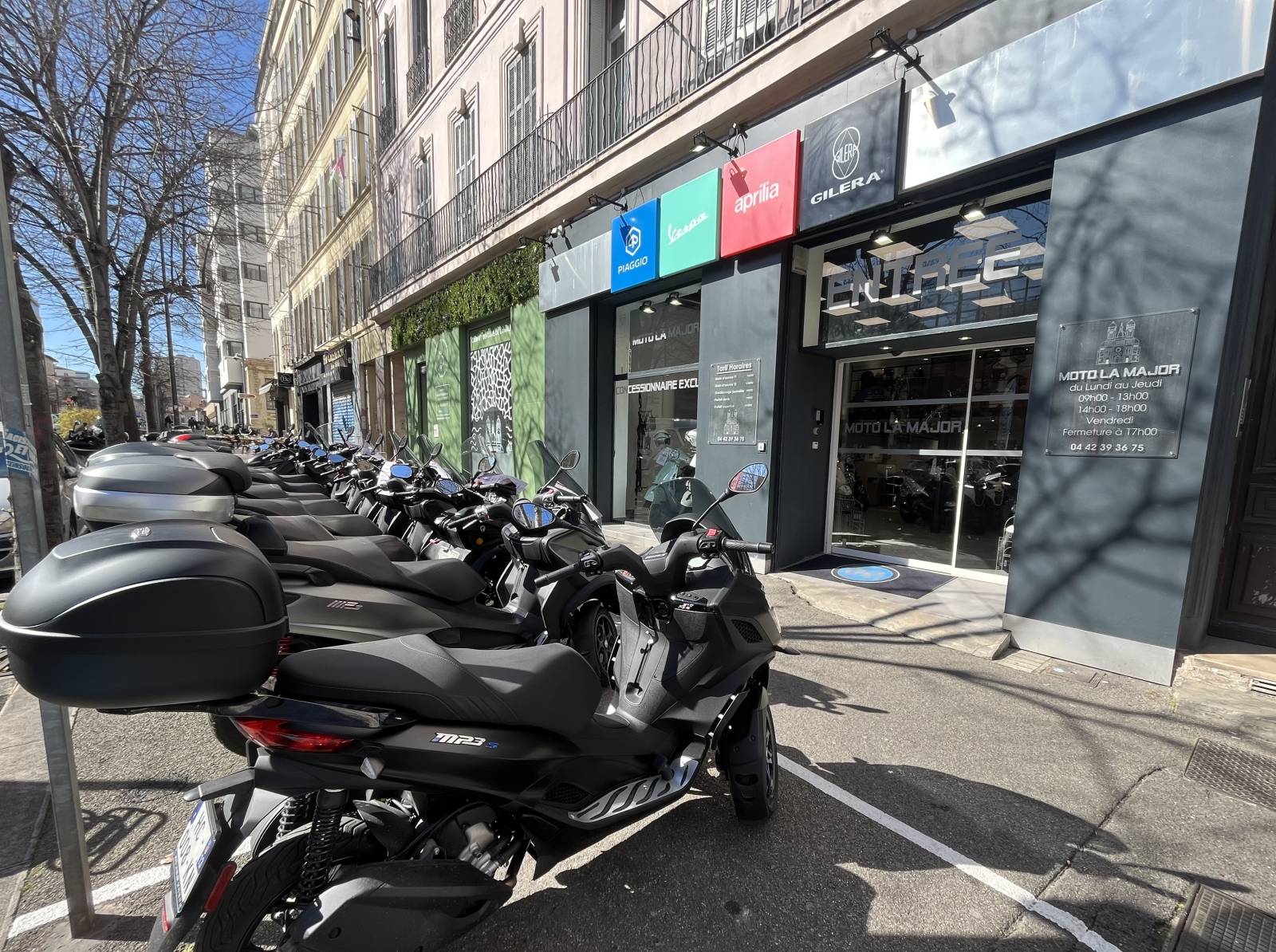 La concession Moto La Major vous propose également d'autres services tels que la vente d'antivols homologués pour les assurances, les entretiens et réparations dans notre atelier à Marseille ou encore la vente de véhicules neufs de la marque PIAGGIO, VESPA et APRILIA.